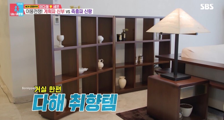 다이닝 공간 역시 우드톤으로 깔끔하게 꾸며져 있었습니다. 냉장고와 약장 역시 칼각으로 완벽하게 정리되어 있었고 침실에는 핑크빛 침대에 화사한 화이트 침구, 은은한 조명이 놓여있어 눈길을 끌었습니다. 액세서리 마다 지퍼백이 담긴 이다해의 옷방도 공개가 되어 감탄을 불러일으켰습니다.
